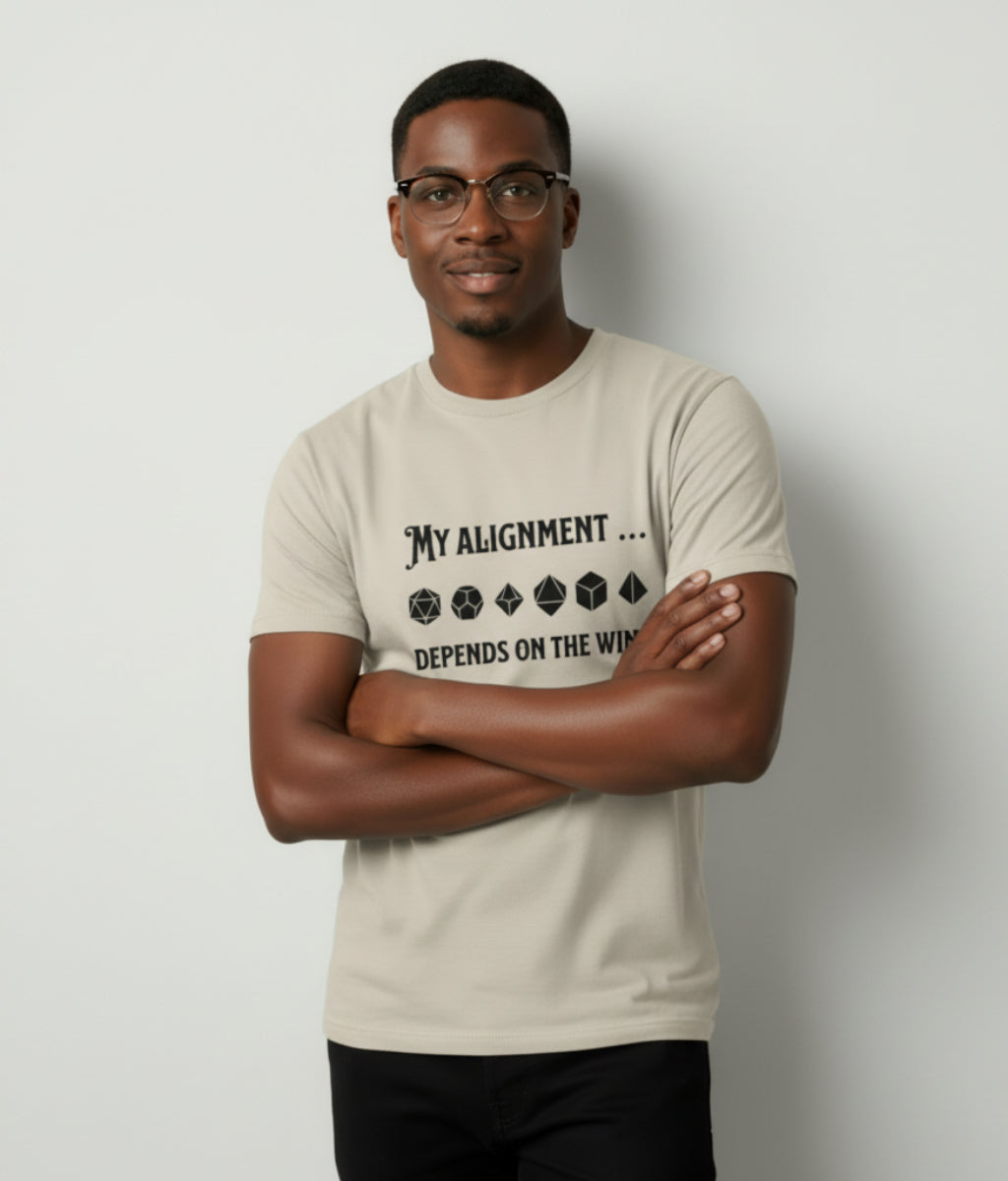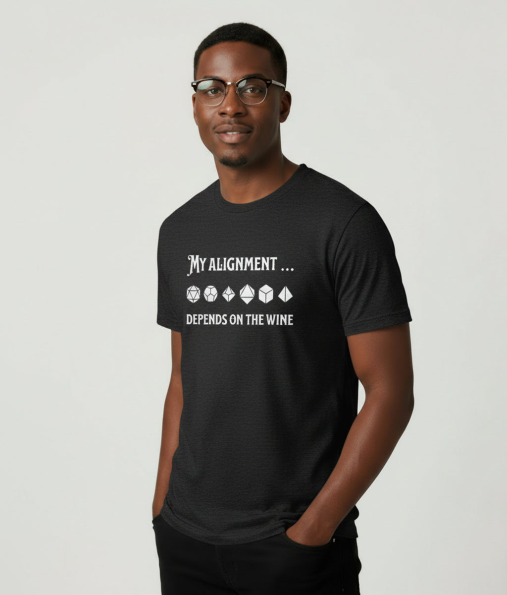 Ah, the eternal question: good, evil, or chaotic…? The answer clearly depends on how many cups of wine have been consumed. This design pairs cheeky text, “My Alignment… Depends on the Wine”, with a playful line of polyhedral dice, hinting that fate itself is swayed by spirits (both magical and fermented).