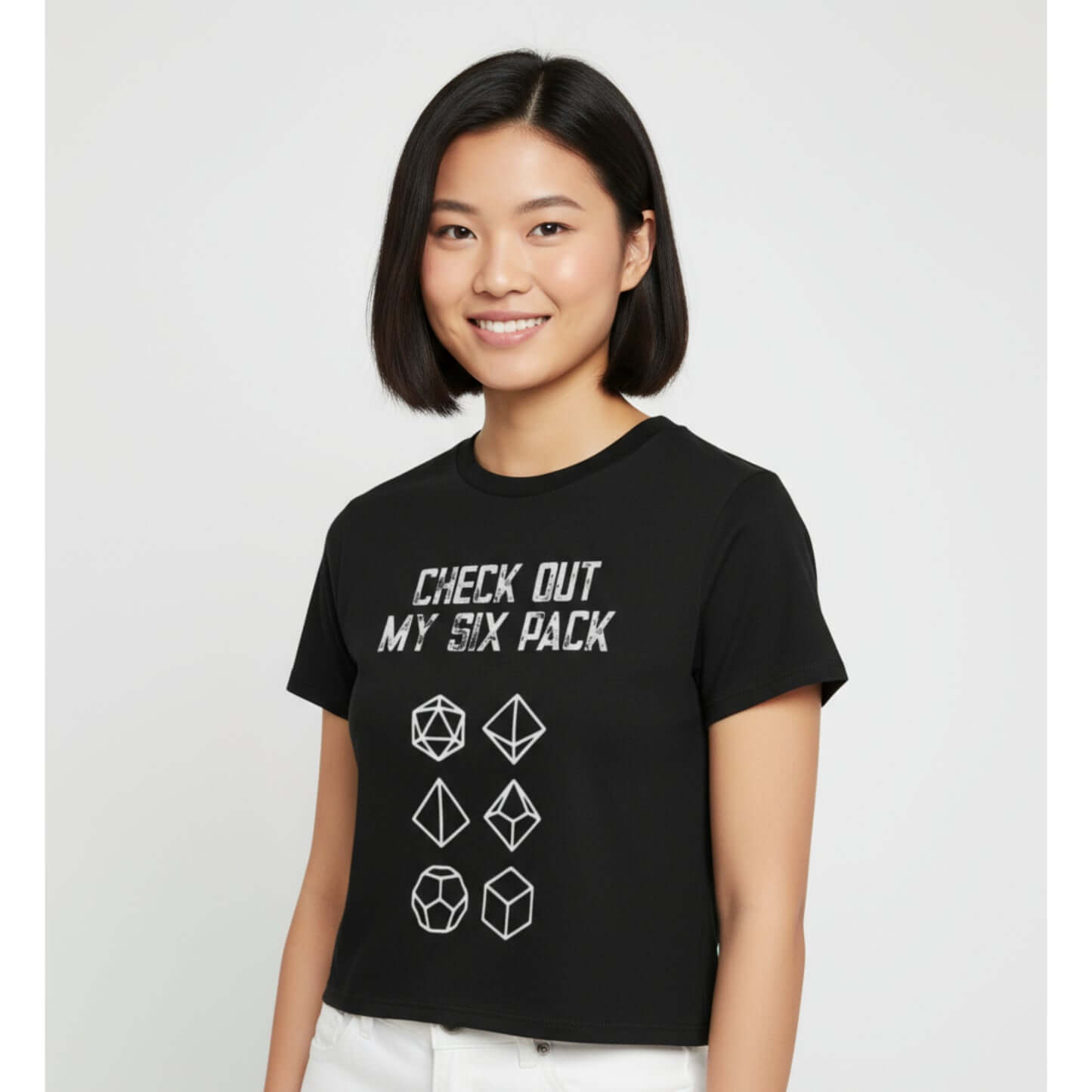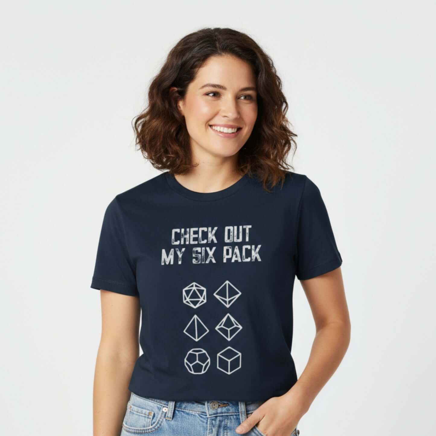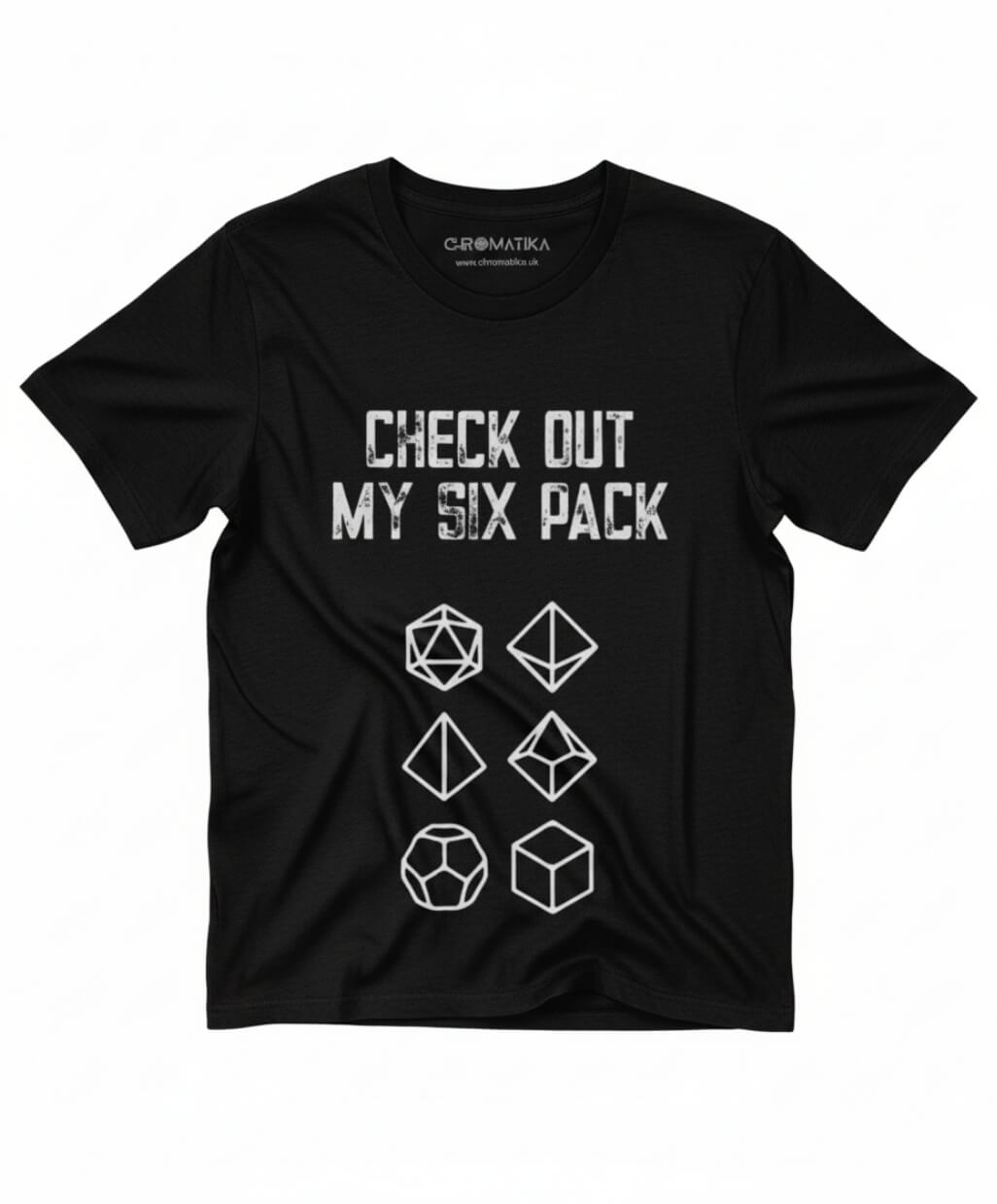 Behold! True strength doesn’t come from lifting weights — it comes from lifting dice bags. This glorious tee proudly displays the ultimate six-pack: six perfect polyhedral dice, lined up like a barbarian’s abs and twice as impressive.