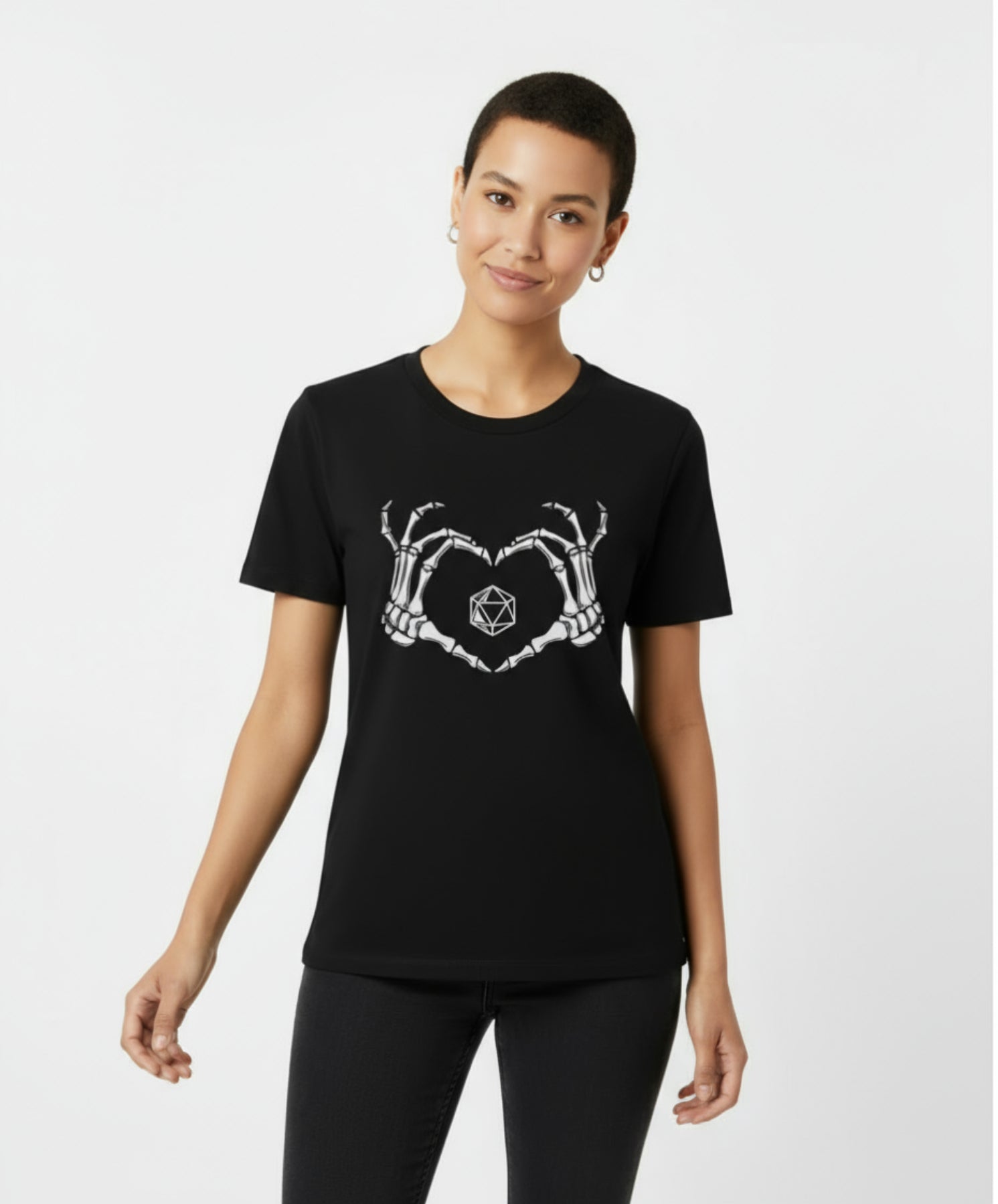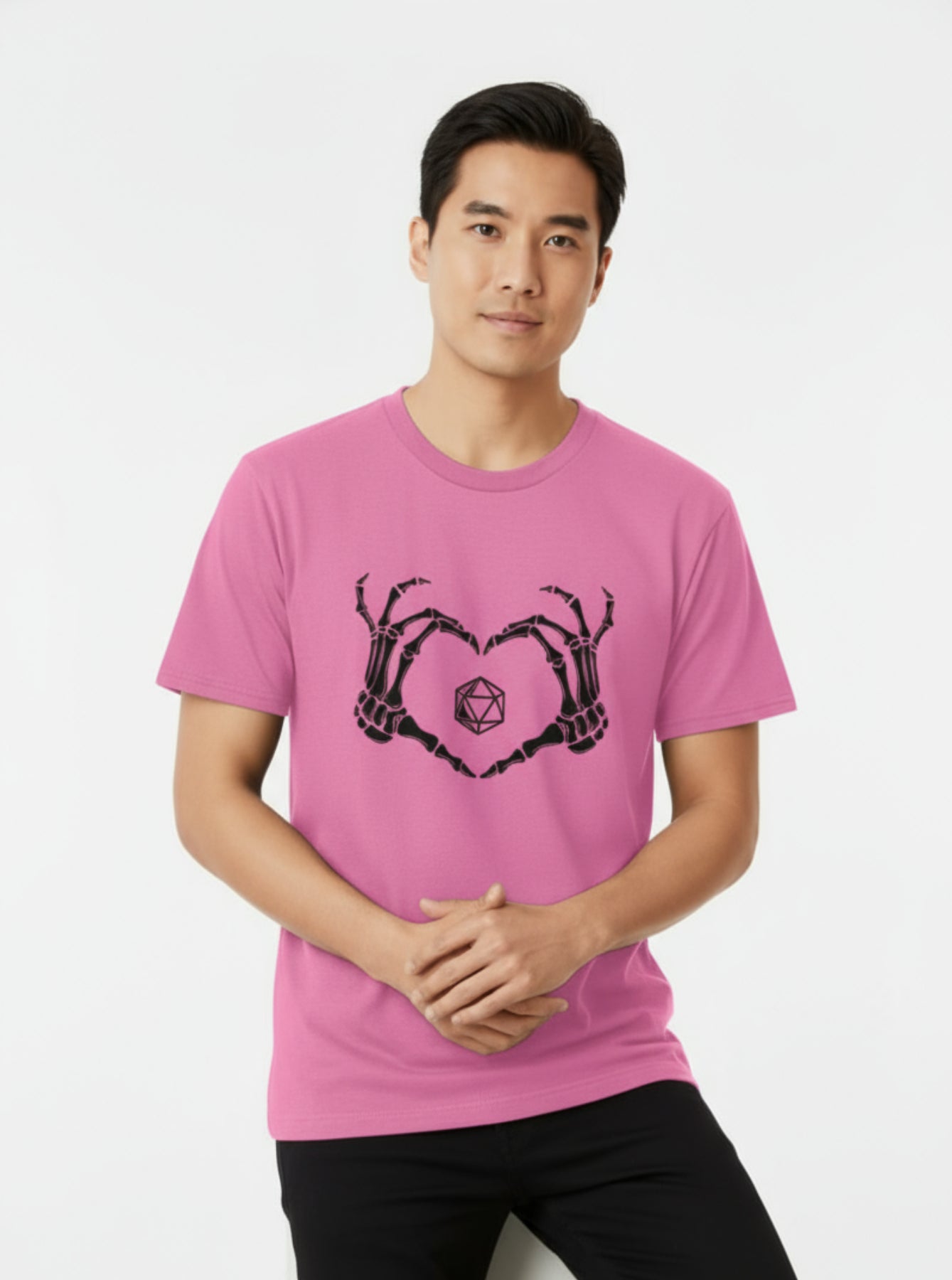Ah, love and dice, perfectly intertwined! This monochromatic design features two skeletal hands forming a heart, cradling a perfectly centered d20, because nothing says devotion like critical rolls.