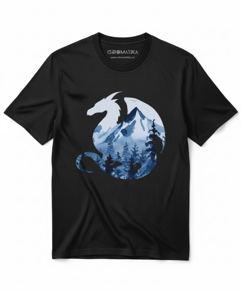Cold winds whisper through mountain passes, and this dragon soars among them—a cool blue silhouette filled with icy peaks and frosted skies. It’s calm, confident, and timeless, like a guardian carved from glacier glass.
