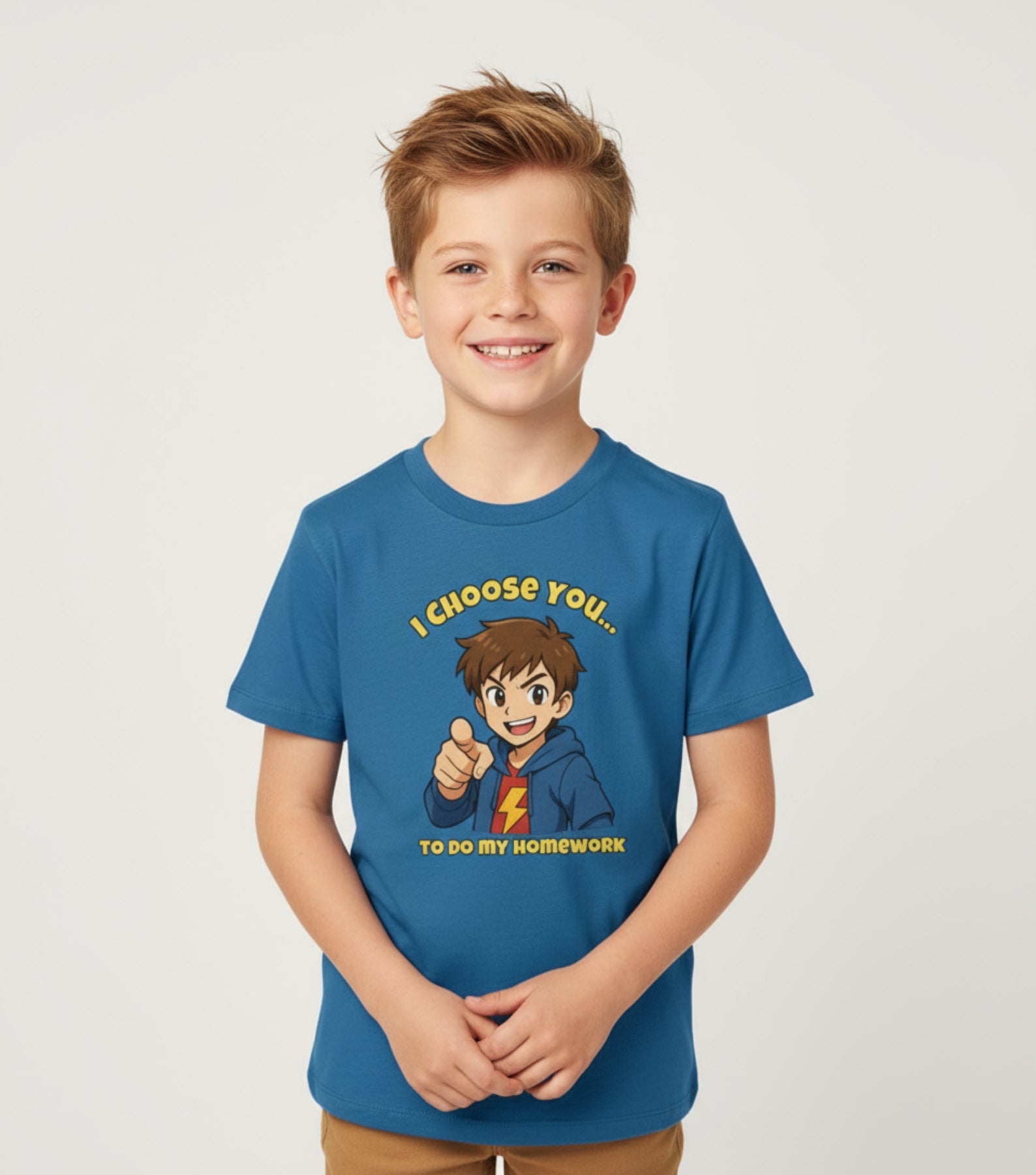 The slogan “I Choose You to Do My Homework!” pops in cheerful lettering, making this the perfect tee for clever, game-loving kids with a mischievous streak.