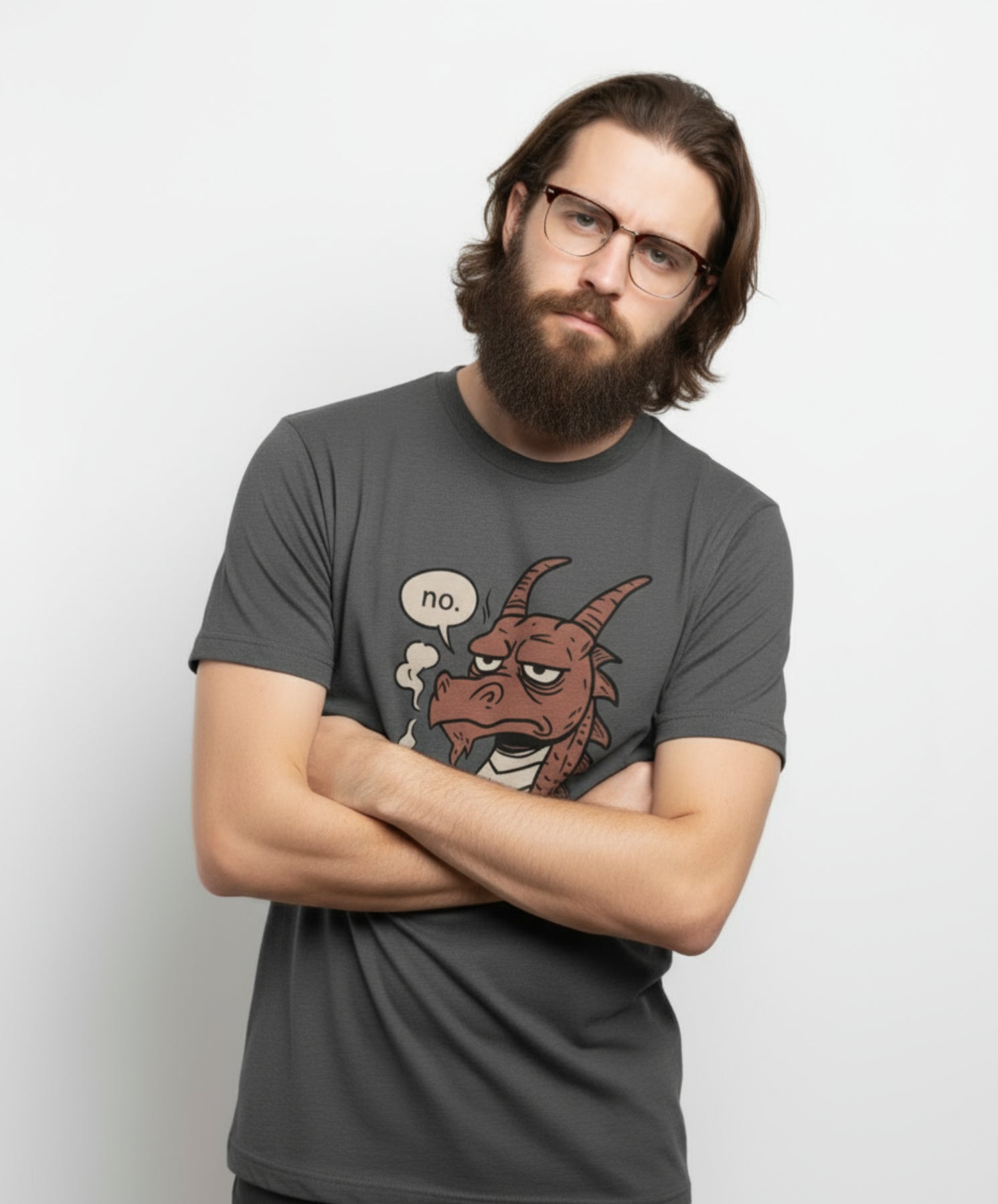 With bold illustration and playful attitude, this tee is perfect for anyone who appreciates dragons, dry humor, or just saying no with style. Wear it to the table, around town, or whenever you need a bit of unapologetic dragon energy in your day.