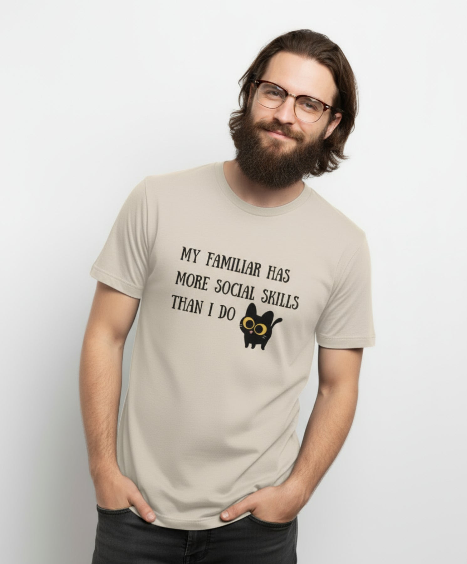 Ah, the trials of being a spellcaster: your magical companion is charming, witty, and effortlessly popular… and you are… well, less so. This design captures the perfect moment with a funny cat sticking its tongue out, cheeky and full of personality, paired with the text: