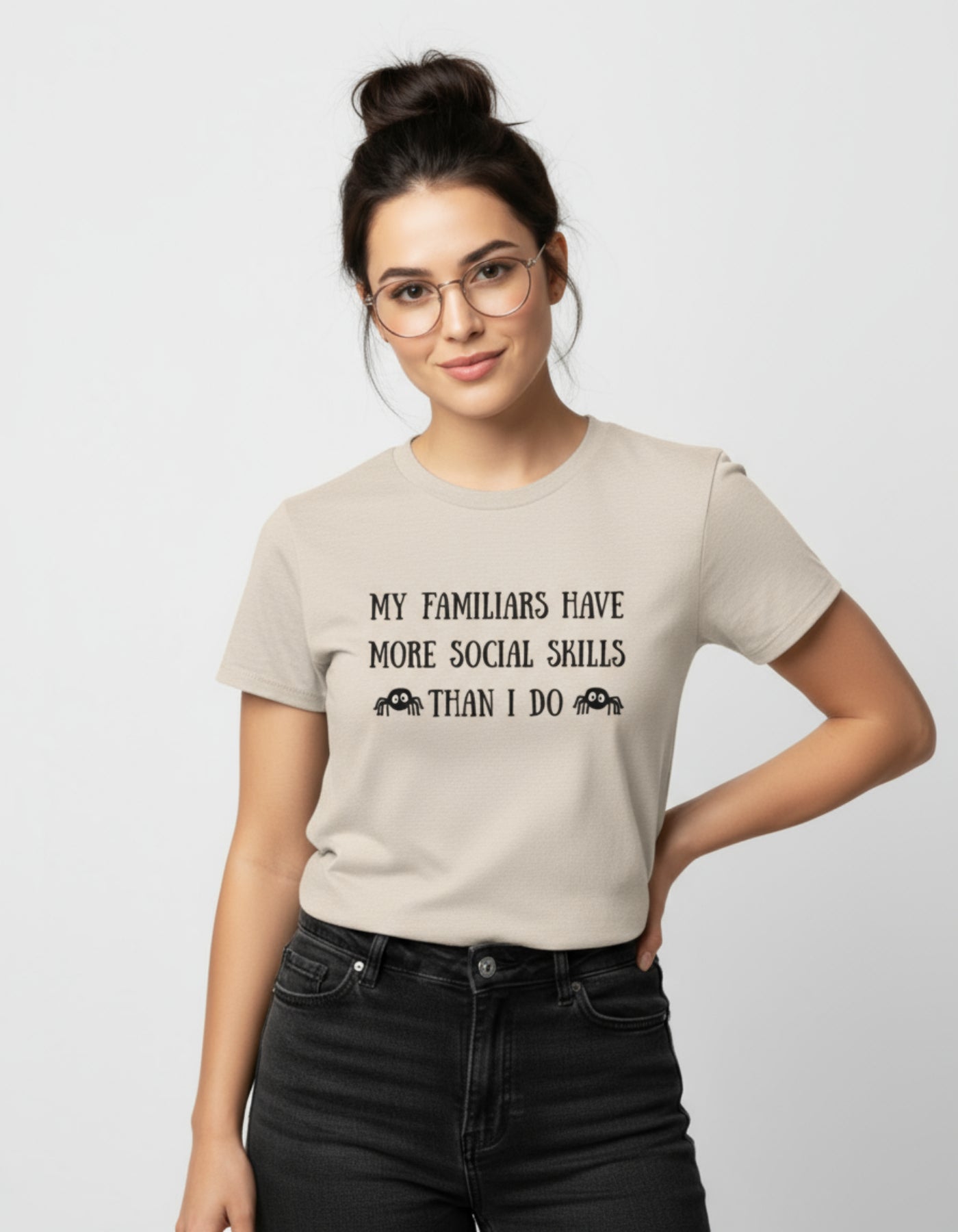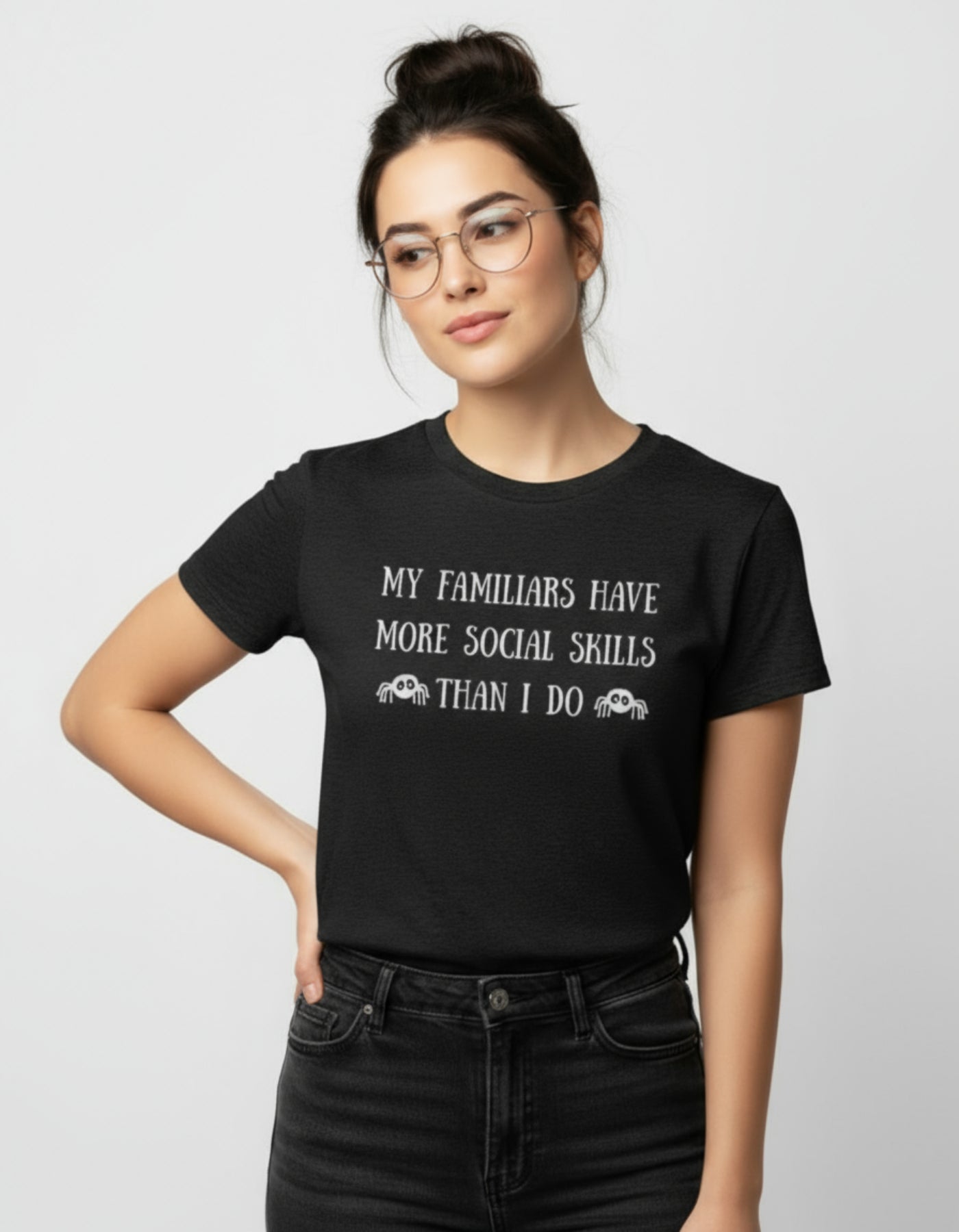 Text reads: “My familiars have more social skills than I do,” perfectly paired with critters who would rather mingle than fight. Bold, playful, and full of geeky humor — because sometimes your magical assistants are just better at making friends.