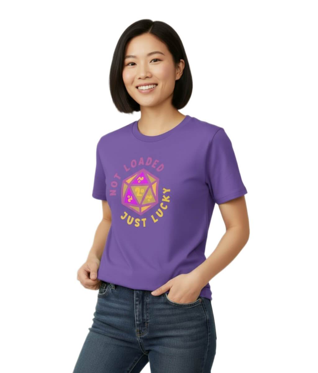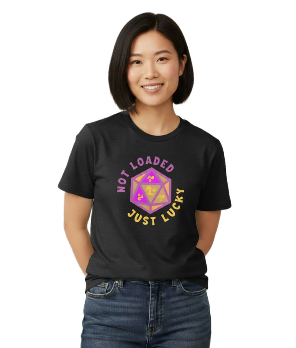 Featuring a bold d20 where every face is a natural 20, it’s pure mischief captured in two radiant palettes — royal purple with gold highlights, or a fiery red-orange gradient for the truly unstoppable roller. Whether you’re charmed by fortune or blessed by chaos, this grunge-style tee lets everyone know: it’s not cheating if the gods like you best.