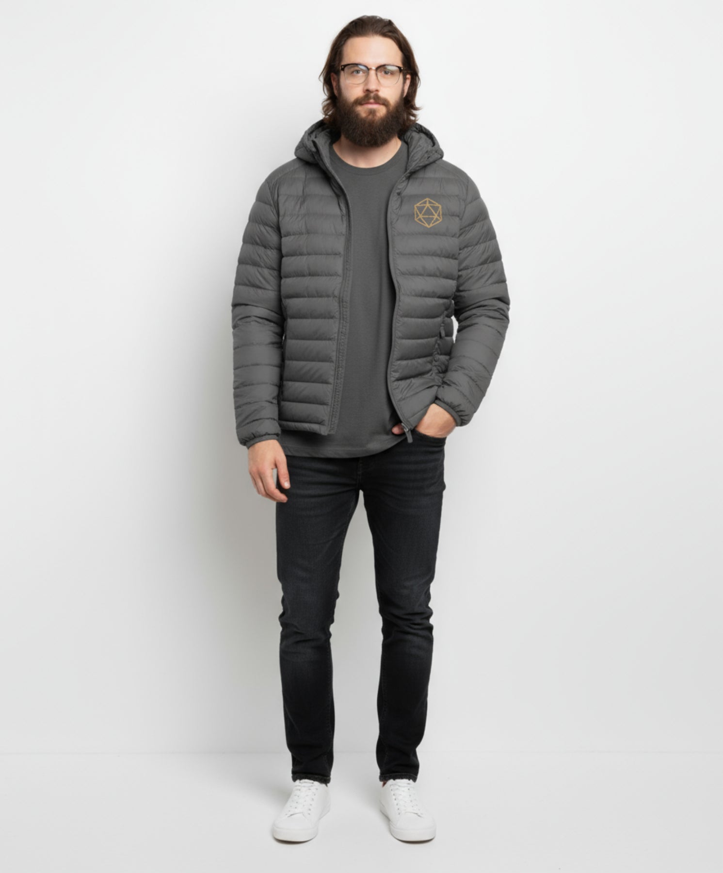 The embroidered d20 glints proudly on the chest — subtle yet sharp, a quiet nod to those who know their rolls. Dressed in sleek, shadowy hues, it’s versatile enough for city quests, forest strolls, or midnight tavern errands.